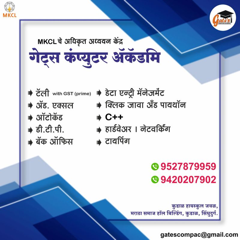 Gates Compac Academy हे Maharashtra Knowledge Corporation Limited (MKCL) द्वारे मान्यताप्राप्त आणि शासन मान्यता असलेले अधिकृत MS-CIT प्रशिक्षण केंद्र आहे. येथे विद्यार्थ्यांना आधुनिक संगणक शिक्षण, डिजिटल साक्षरता आणि प्रॅक्टिकल आधारित प्रशिक्षण दिले जाते. अनुभवी प्रशिक्षक, अद्ययावत अभ्यासक्रम आणि उत्तम सुविधा यांच्या मदतीने विद्यार्थी संगणक कौशल्ये आत्मसात करून शैक्षणिक व व्यावसायिक क्षेत्रात प्रगती करू शकतात.